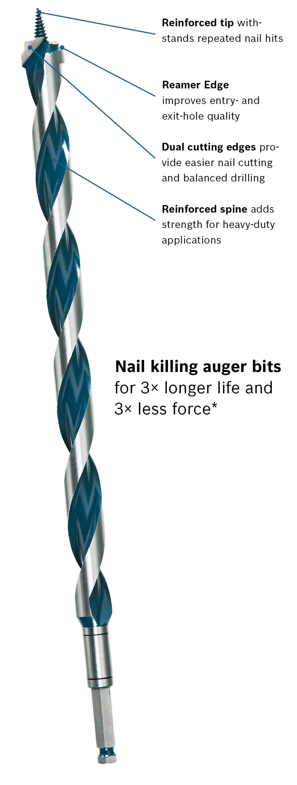 - Bosch Daredevil™ auger bits are easy in wood, tough on nails