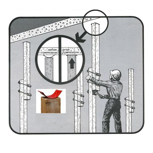 No more wasted lumber or labor used in cutting and nailing shims to the top and bottom of each shore. Just one nail hole is needed to secure the reshore spring to your shore tops. Although 200 lbs compresses each reshore spring flat, it returns to its original shape to be used again and again.