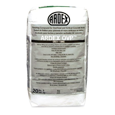 ARDEX OVP™ is a trowelable finishing compound used for tilt-up walls, pre-cast or poured in place concrete panels, and other concrete or masonry surfaces. When mixed with water, it renders a creamy, smooth consistency ideal for filling in surface defects such as spalls, gouges, cracks, dents, chips, bug holes or honeycombs – any type, size or shape of surface defect that needs to be filled and smoothed before coating.