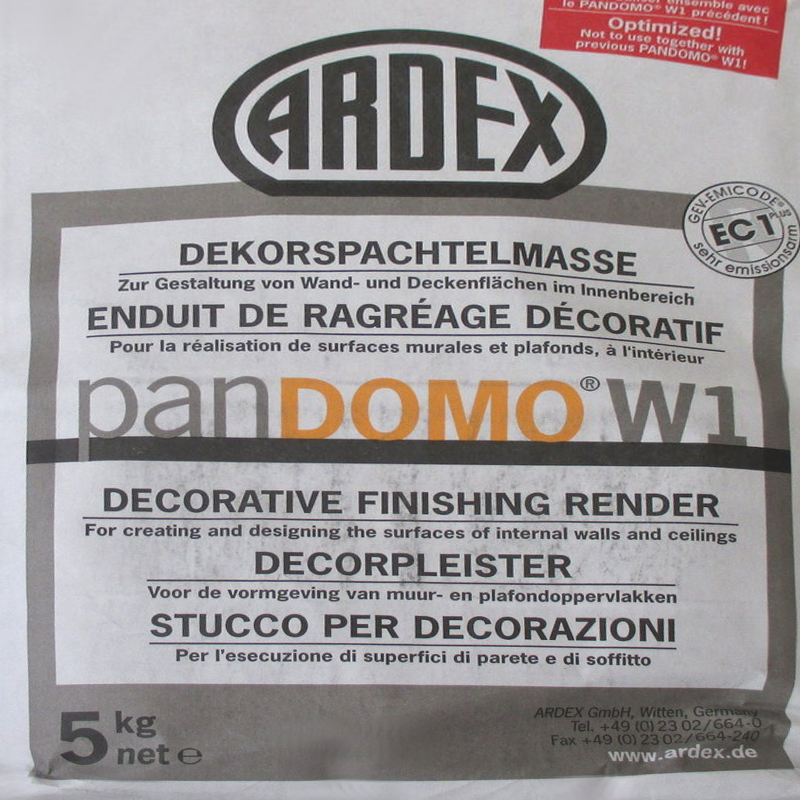 ARDEX PANDOMO® W1 is a self-drying, trowel applied finishing compound for walls and ceilings. Formulated with a blend of Portland and other hydraulic cements and special re-dispersible powdered polymers, ARDEX PANDOMO W1 exhibits excellent non-sag properties and hardens quickly. ARDEX PANDOMO W1 has excellent adhesion over a wide variety of porous surfaces, including concrete, gypsum plaster, drywall and all types of masonry surfaces. Use ARDEX PANDOMO W1 for producing high-end, creative ARDEX PANDOMO Wall surfaces in areas such as retail stores, shops, hotels, cafés and vestibules, as well as for residential applications.
