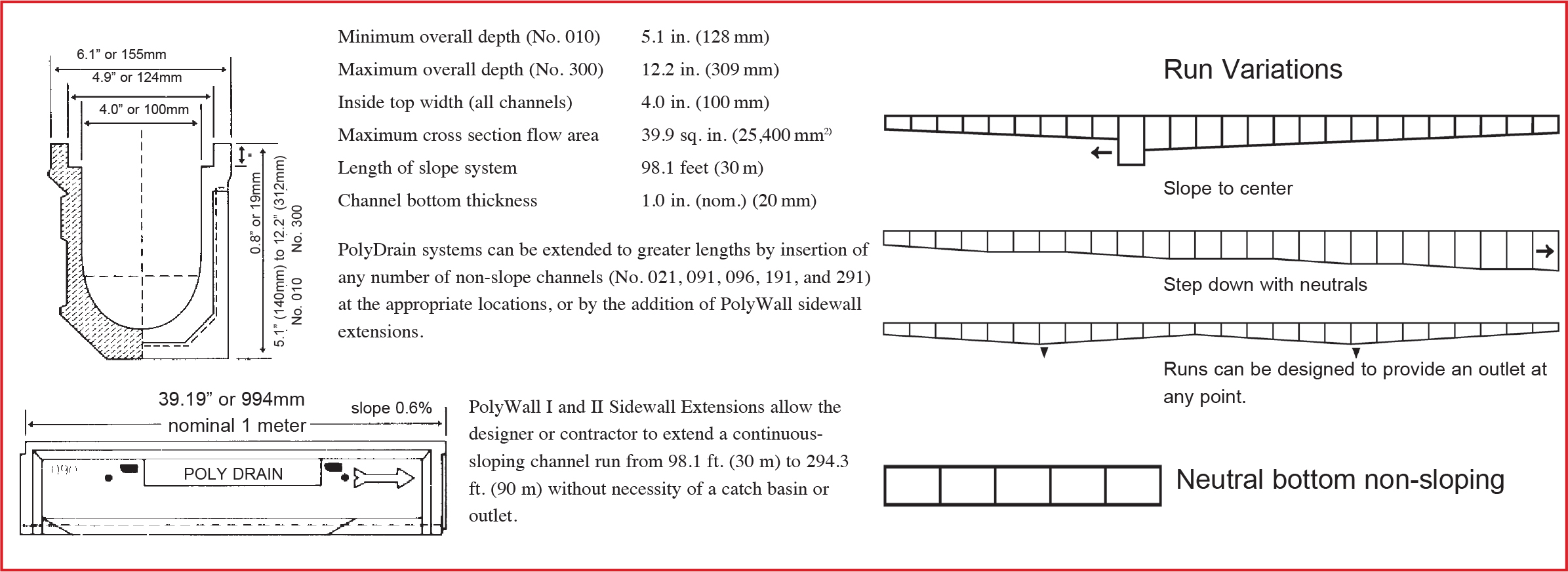 PolyWall I and II Sidewall Extensions allow the designer or contractor to extend a continuous- sloping channel run from 98.1 ft. (30 m) to 294.3 ft. (90 m) without necessity of a catch basin or outlet.