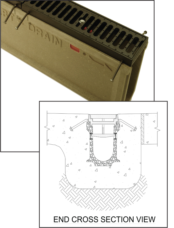 PolyDrain channels are formed with full-length anchoring ribs on each side of the channel at the base of the side wall. These anchoring ribs provide a positive mechanical lock with