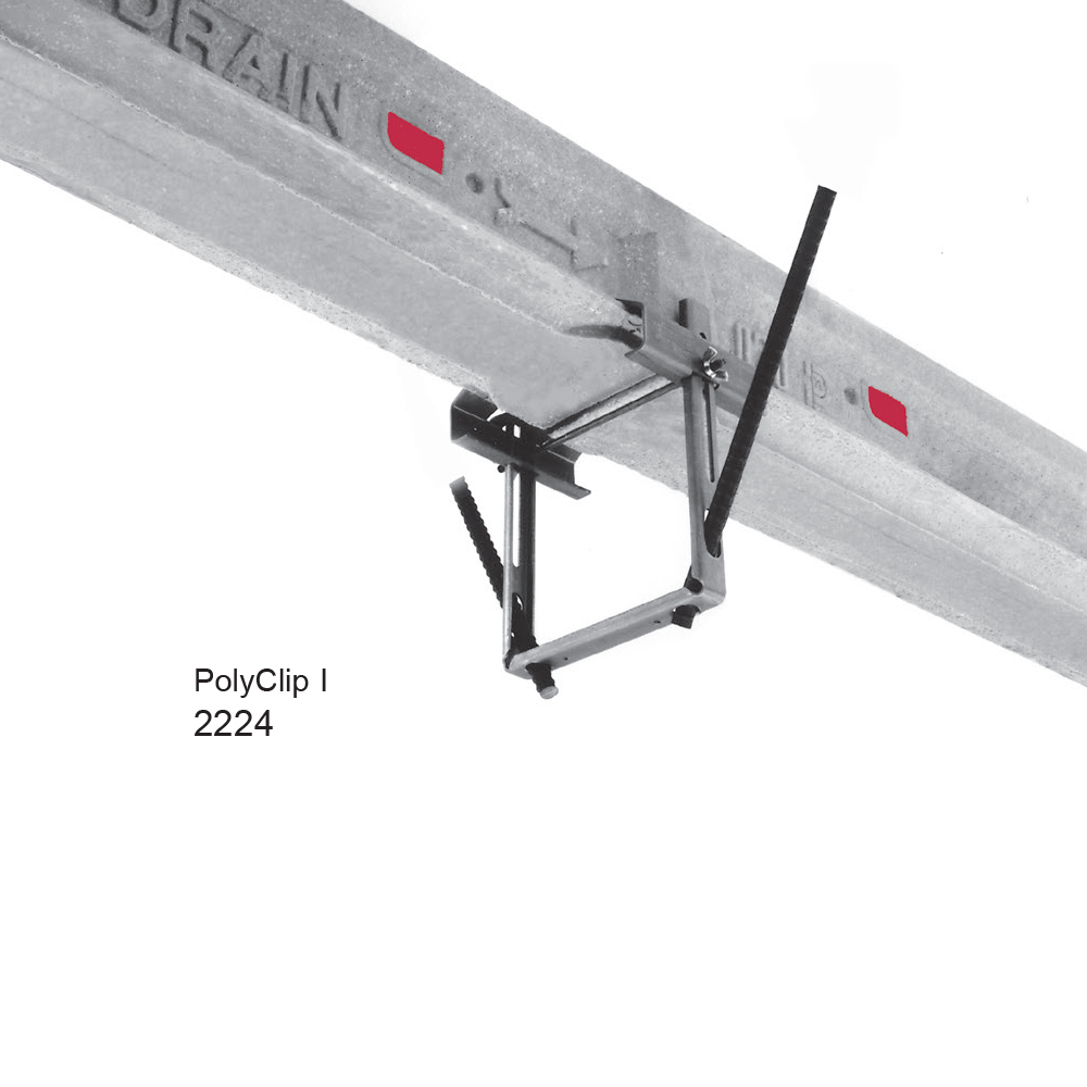 PolyClip was developed to speed channel installation and make the joining of the channels more secure before the pour. PolyClip consists of: two special securing brackets (one for either side of the channel); a “no-float” U-shaped leg that serves to maintain proper height and keep channels from floating during the pour; and a securing bolt to keep the entire appliance attached to the channel.