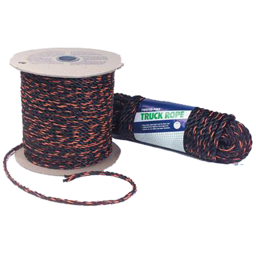 CWC polypropylene truck rope. Durable, rugged rope, good for outdoor, hauling use. Made from color-safe, durable polypropylene fiber, allowing for lifetime color and minimal stretch. Designed to not rot or deteriorate. Conforms to California State Highway Patrol requirements. Rope is black with orange tracer.