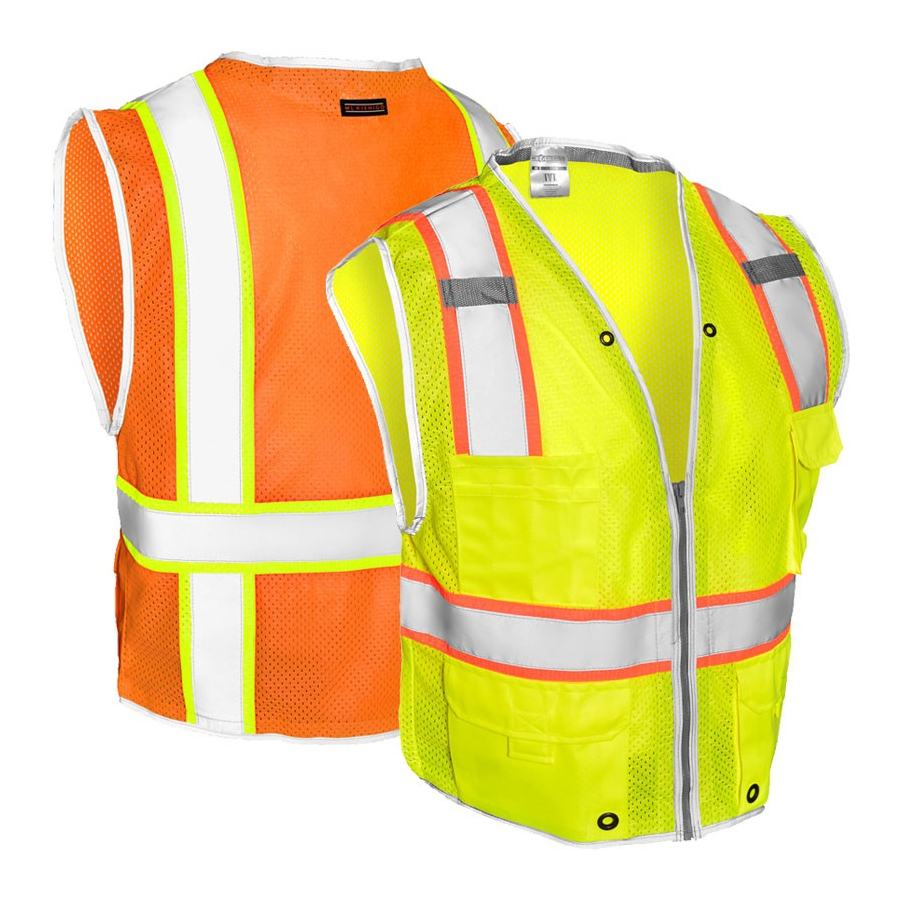 - Fluorescent yellow vest has 3″ wide orange reflective material with 2″ wide silver reflective material stripes
