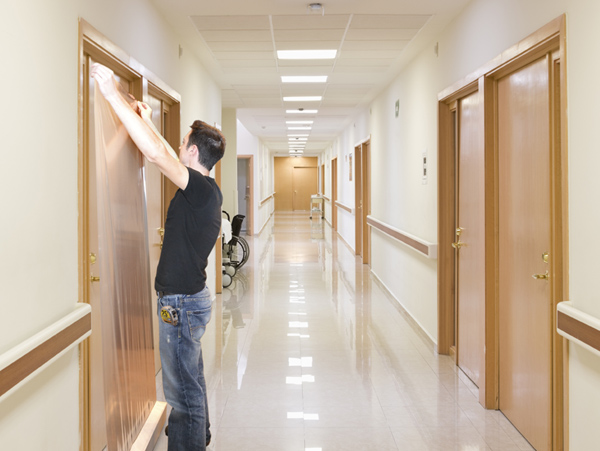 Protect many doors for large construction projects with Door Armor. This heavy duty, co-extruded film resists and prevents marks and scratches. It has a unique resin that adheres to almost all smooth and lightly textured surfaces. Use it on factory finished metal and wood doors, composite, even glass; without the risk of adhesive residue. This door protection film is easy to apply and allows for fast application and removal.
