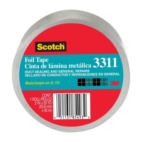 Scotch Aluminum Foil Tape 3311 is an excellent choice for general purpose repair and maintenance, and for temporary and emergency repair of metal surfaces. The sturdy foil backing is set on a paper liner to preserve the adhesive and aid in the ease of deployment. This tape resists flame, moisture, UV degradation, water vapor, odor and smoke transmission. It is also chemically resistant, thermally conductive, heat reflective and light reflective – making it an ideal choice for sealing aluminum faced insulation seams and joints.