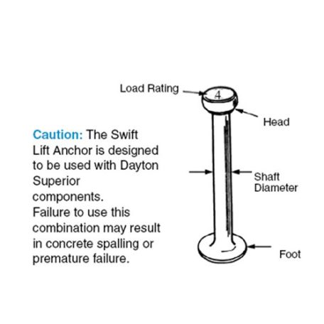 The Dayton Superior Swift Lift Eye Anchor (P53) is similar to the P52 anchor but has an eye at the foot to accept P60 Tension Bars. The P53 anchor is used primarily in thin sections, thin panels of lightweight concrete or shapes that must be handled at concrete compressive strengths below 2,000 psi. P53 anchors are available in 1, 2, 3, 4, 8 and 16 T capacities and each has its load rating embossed on the head. NOTE: P60 Tension Bar must be used with this anchor to achieve loads.