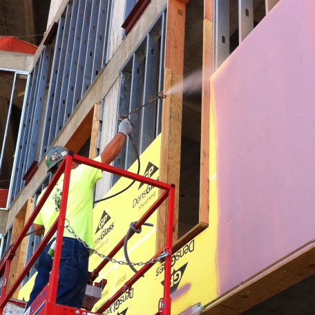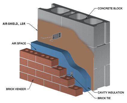 AIR-SHIELD LSR may be sprayed on at the minimum coverage rate of approximately 17 – 22 ft.2/gal. (0.42 – 0.54 m2/L) (75 mils wet) (40 mils dry). Note: For roller applications or during periods of extremely hot weather, two coats may be necessary if the material begins to slump. Apply second coat after first coat has completely dried, approximately one to two hours after first coat. Frequently inspect surface area with a wet mil gauge to ensure consistent thickness. Work material well into any fluted rib forming indentations. Porous masonry block walls may require additional coats to obtain desired thickness.