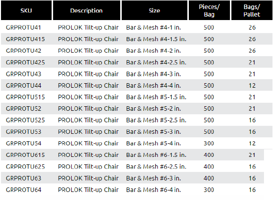 With over 10,000 buildings, enclosing more than 650 million square feet being constructed, tilt-up construction is one of the fastest growing construction industries in the U.S. Since all tilt up construction requires rebar or wire mesh, the PROLOK Tilt-Up Chair is a vital component to any project. The patented locking head design and other efficient components reduce ties and prep time by approximately 50 percent. The EZ Flow base allows concrete to flow smoothly through the panel’s reinforcing grid, while the 4-point base leaves an invisible footprint.