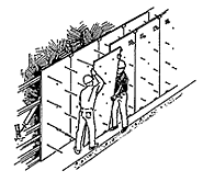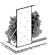 To erect additional sheets, tack sheets to footing plate. Temporarily hold in place with snaptie, “A” bracket and short 2X4. Make sure vertical joints are tight.