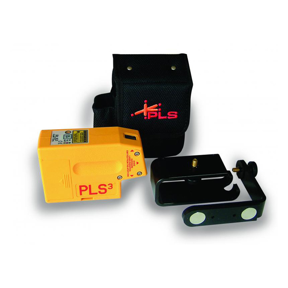 Point-to-point self-leveling plumb and level laser tool. Includes wall bracket, floor base, pouch, and operating manual.