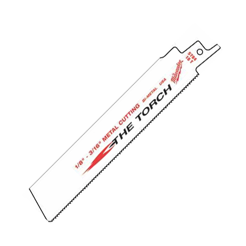 The Torch delivers exceptional durability and straighter cuts in pipe, conduit, strut and other metal materials. (5) 6″ 14 TPI The Torch Sawzall Blades FEATURES A unique combination of relief angles forms a radius on the back of the tooth that reduces stress build-up during cutting and substantially extends blade life.A precise manufacturing process creates a sharper cutting edge on each tooth for a faster cutting blade.A thicker, more rigid blade body resists fracturing and bending for maximum durability.The 1″ tall blade body reduces blade twisting for straighter, more accurate cuts.Matrix II bi-metal teeth for greater durability. SPECIFICATIONS Blade Dimension 6″x1″x.042″Shank 1/2 in. UniversalTPI/Grit 14 TPIPackage Quantity 5